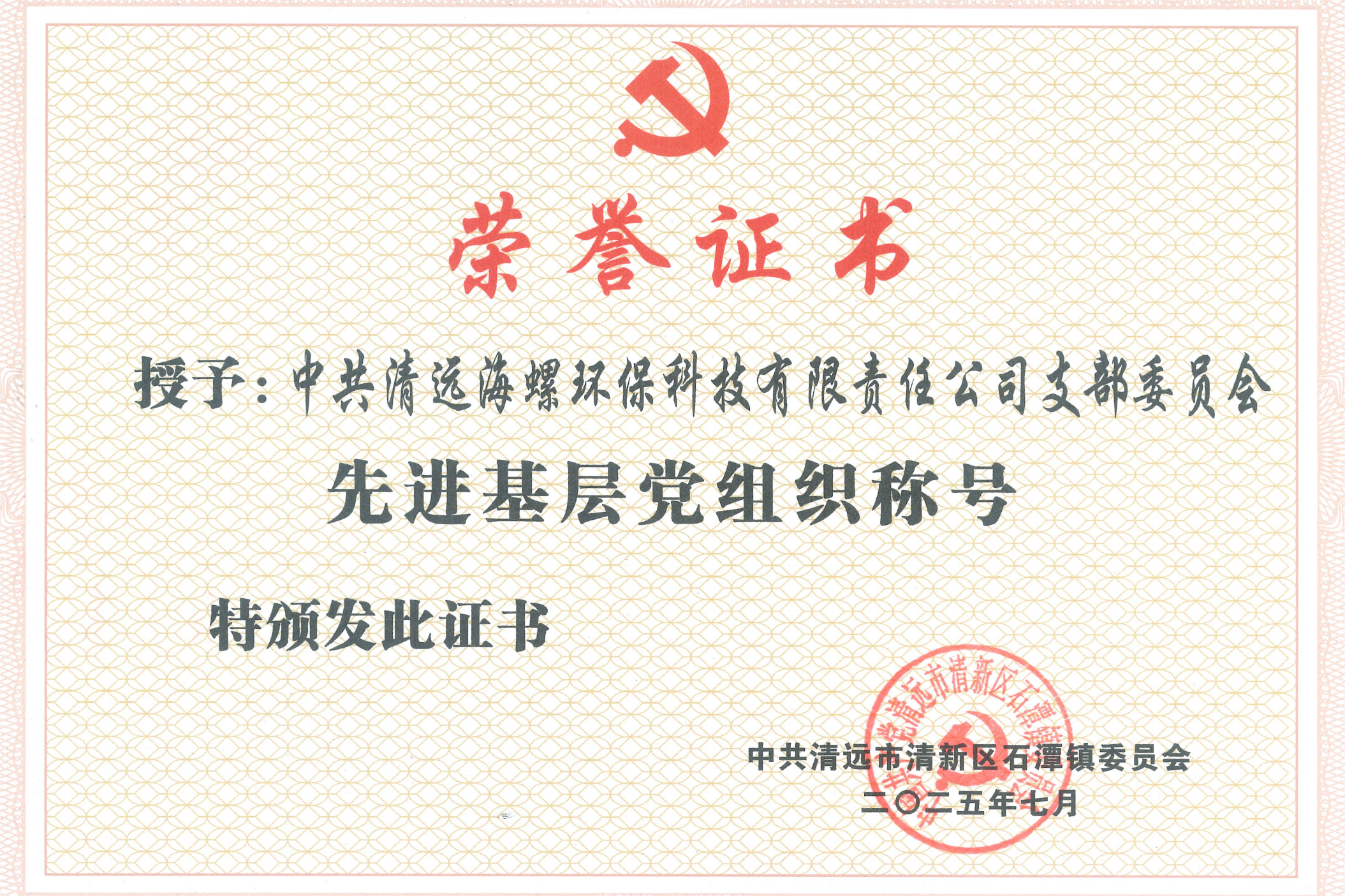 清遠螺環保黨支部榮獲“先進基層黨組織”稱號