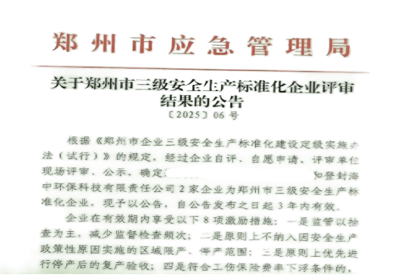 近日,登封海中環(huán)保公司順利通過三級安全標準化評審,取得鄭州市應急管理局頒發(fā)的評審通過證明文件。三級安全標準化評審通過標志著企業(yè)在安全生產(chǎn)標準化、精細化管理領域邁入新階段,不僅是對公司安全管理體系的高度認可,更彰顯了其“以安全為生命線”的責任擔當,為環(huán)保行業(yè)規(guī)范化發(fā)展注入新動能。
