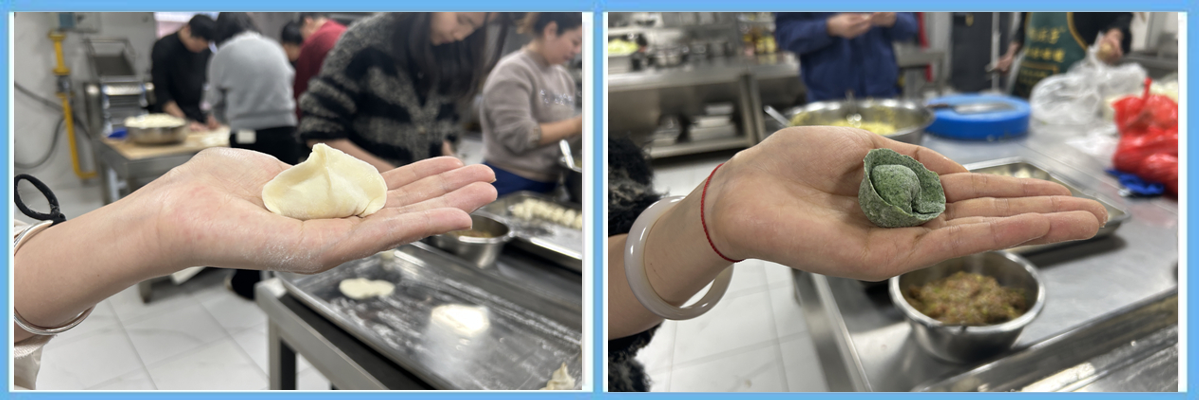 “先取適量餡料放在皮中央,然后對(duì)折,從一邊開始捏褶子……”食堂面點(diǎn)師傅現(xiàn)場(chǎng)教學(xué),不少員工第一次嘗試包餃子,手法雖顯生疏,但熱情高漲。老員工們則大展身手,包出的餃子形態(tài)各異,有的像元寶,有的似月牙,各有各的特色。